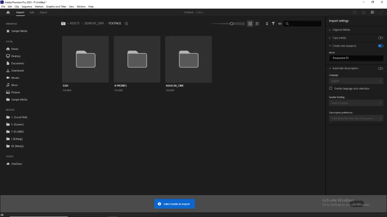 When using Import Mode, you can navigate your file structure within Premiere Pro and import X-OCN footage without leaving the NLE. This approach will organize all the X-OCN clips into one bin.