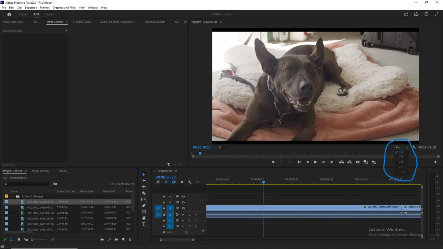 To do this, go to your Program Viewer window. In the bottom right corner of this window, you will see a dropdown menu that says Full. When clicking on this menu, you will get several options to reduce the playback resolution of your footage, either by 1/2, 1/4, 1/8, or 1/16. Editors can stay in the X-OCN codec, cut and color their project at a reduced playback resolution, and quickly deliver a final edit.