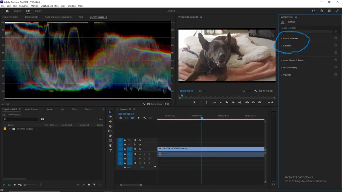 A more flexible approach is called “coloring under a LUT.” You do this by applying your LUT to a clip in the Creative Look Menu. This will apply the LUT at the end of your image pipeline, after any corrections or adjustments made in the controls available in the Lumetri Edit Menu.