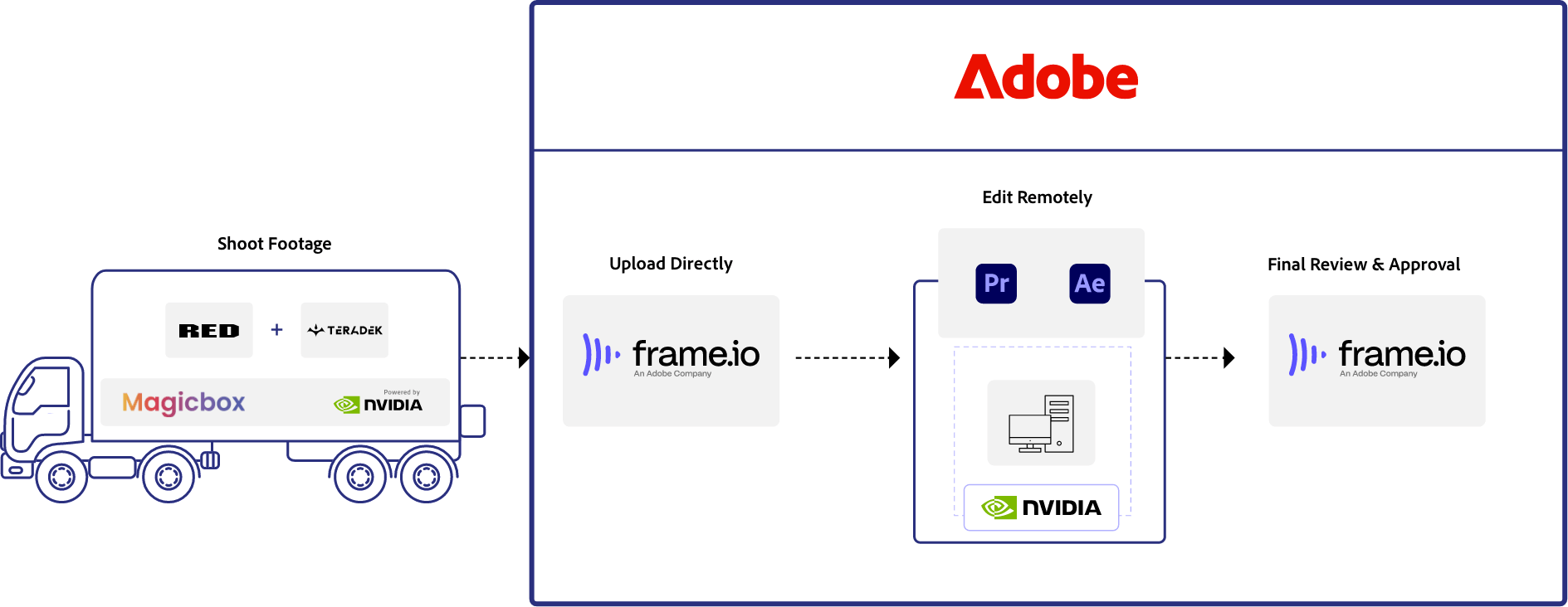 The complete end-to-end video workflow was made possible by Adobe’s close collaboration with our video partners. As a result, end customers can enjoy one of the fastest, most efficient, and cost effective workflows for the creation of high quality virtual production content available on the market.