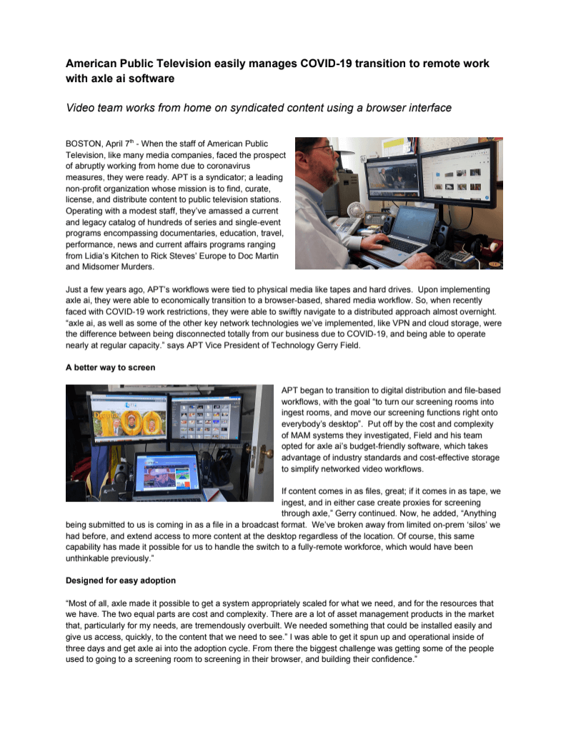 Whether you’ve just started to work remotely, or you’ve always been a distributed team, axle ai enables users to access centrally stored media from anywhere, securely, via our reverse proxy workflow. Take advantage of all the capabilities of axle ai, including ai-powered auto tagging and downloading your original hi-res files, from any web browser when you’re on the road, on location, or in the home office.