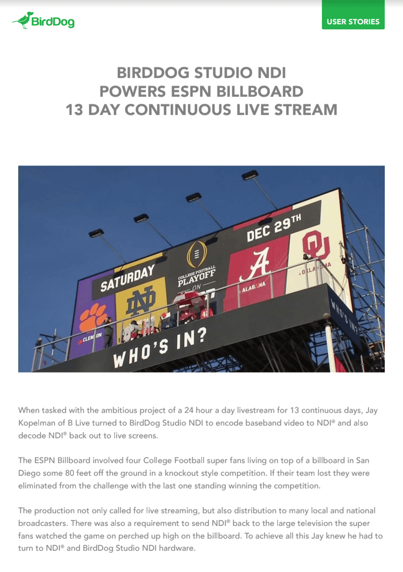 BirdDog is at the forefront of collaborative IP-based video workflows. Offering directly integrated hardware solutions for Adobe Premiere Pro and After Effects providing realtime video inputs and outputs via the NDI networking protocol. BirdDog solutions allow your next project to include remote interactive review and approval plus game-changing Ethernet based I/O solutions.