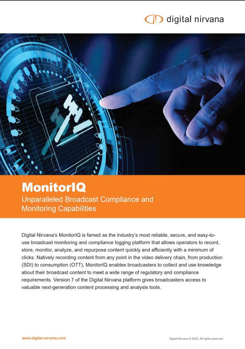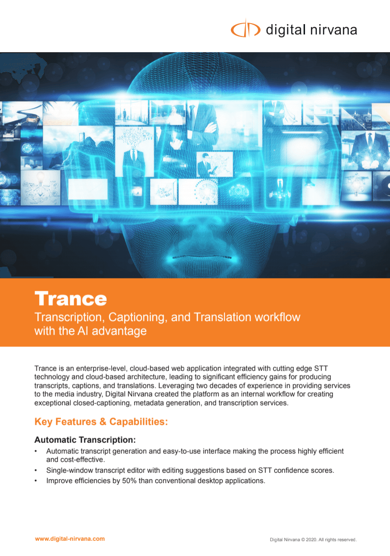 Digital Nirvana delivers knowledge management technologies that empower organizations worldwide to create content, automate the generation of captions, subtitles, and metadata, as well as monitor the delivery of broadcast media. Built on two decades of industry experience, the company’s products Trance and MonitorIQ address the needs of modern broadcast media companies by harnessing best-of-breed video, audio, and AI technologies to drive new levels of speed, creativity, quality, and insight.