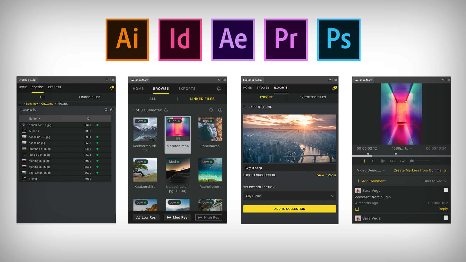 With panel plugins for Adobe Premiere Pro CC, Adobe After Effects CC, Adobe Illustrator CC, Adobe Photoshop CC, Adobe InDesign CC, and Adobe InCopy CC, no matter what creative application is being used, Evolphin Zoom allows you to work smarter and faster without having to leave your app. Every Evolphin Zoom plugin has the same powerful features with robust search and filtering, enabling creatives to find the media they need instantly and add it to their project. Comments from reviewers using Evolphin Web Collections are pushed back to the creative’s app in real-time, making collaboration a breeze. The project stays synced to the DAM/MAM and takes advantage of Evolphin Zoom’s industry-leading version control.