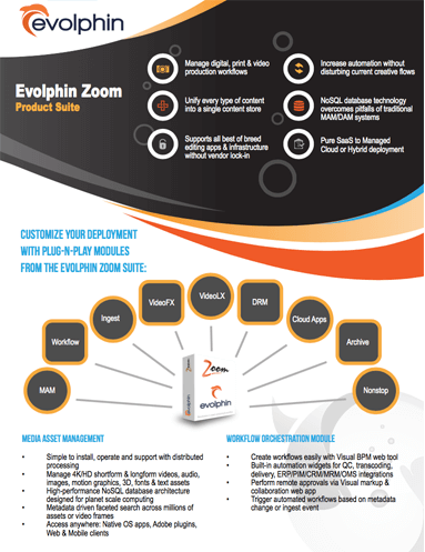 Evolphin Zoom combines Digital, Media and Production Asset Management into a single platform connecting marketing programs with content production, distribution and extensive analytics. Our target verticals are Healthcare, Media & Entertainment, Broadcasting and Sport. Highly secure, the solution is massively scalable and deployed on-premises, in the cloud, or hybrid. Zoom manages any file type, versions, and metadata, including images, audio, 4K/8K video, Office documents, and any creative projects with rich plugins for all Adobe applications and Cinema4D. Built-in collaboration tools allow commenting, review, and approval on any device, in real time. Completely AI enabled, the platform is tightly integrated with Storage, Archive, Transcoders and most infrastructure systems. For those customers wanting to transition to Adobe workflows from Avid, Zoom is the bridge.