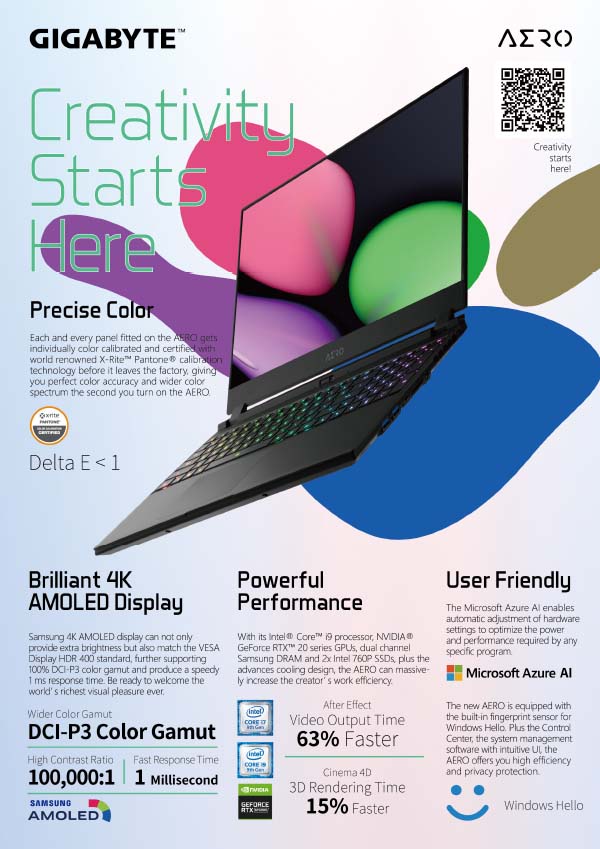 GIGABYTE AERO laptop features X-Rite™ Pantone® calibration technology. Each and every panel gets individually color calibrated, offering the perfect color reference to ensure your creations are represented exactly how you expect to see them.