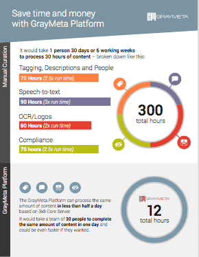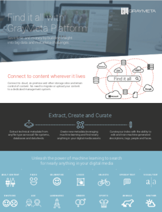 GrayMeta Curio is a robust solution designed to search all of your files. It combines powerful search, content analysis, and best-of-breed AI driven insights for people, logos, audio and black frames all in one place, creating unimaginable value.
