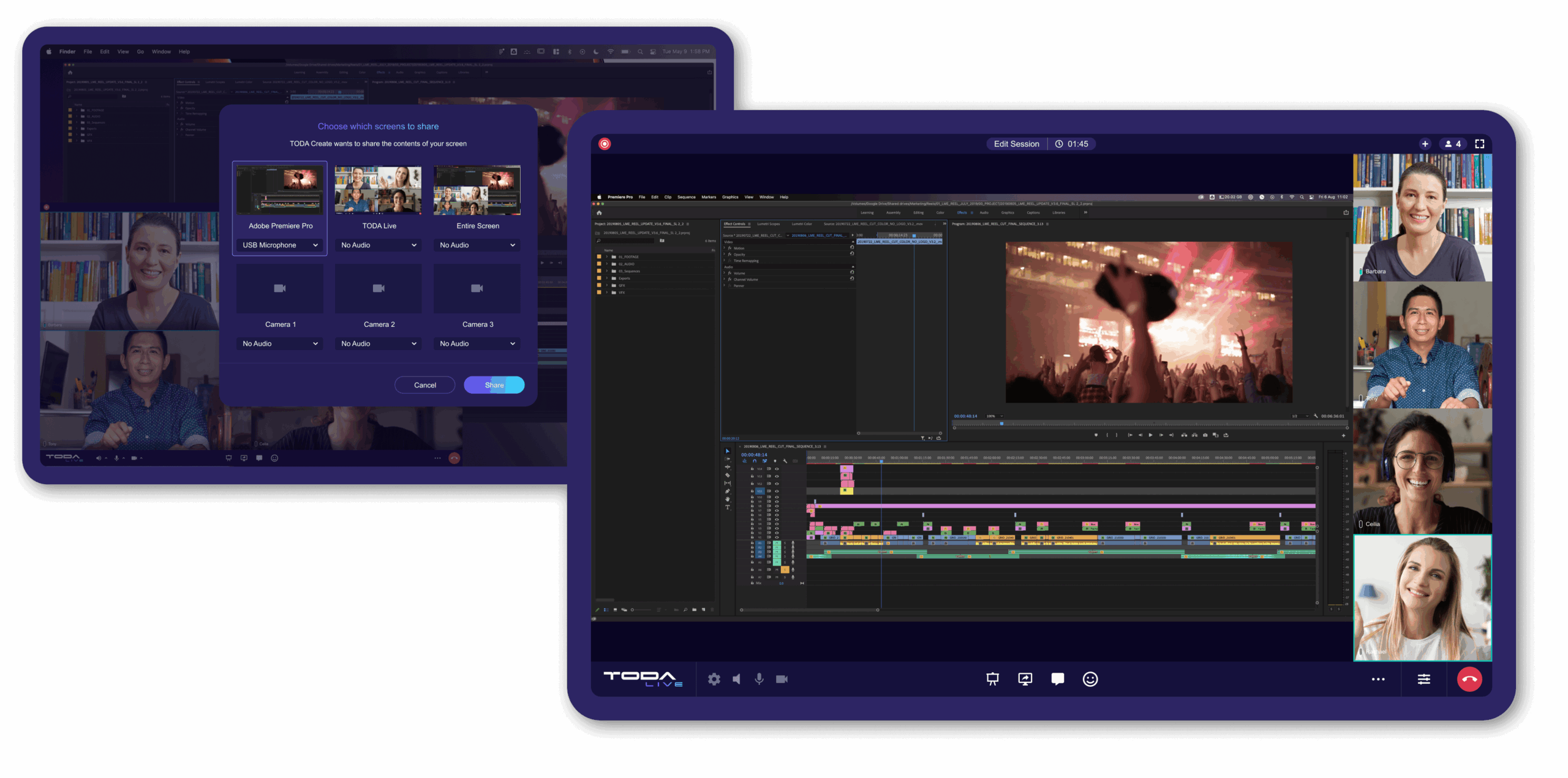 The TODA Live desktop application integrates with Adobe Premiere Pro through a plugin, enabling one-click streaming of video and audio into a collaborative space. Users can invite their team to watch videos and assets live, facilitating real-time conversations and collaboration on projects.