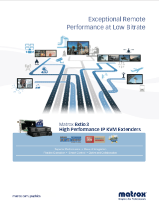 Matrox Extio 3 IP KVM extenders are the world’s first IP KVM extenders to deliver 4Kp60 4:4:4 performance—or dual 4Kp30 4:4:4, or dual 2560x1600p60 4:4:4, or quad 1080p60 4:4:4 capabilities—over a standard one Gigabit Ethernet network at unprecedented low bitrates. Redefining IP KVM extension technology, Matrox Extio 3 Series cards and appliances are capable of providing 4K, desktop-quality video using just 5% of the network bandwidth required by the next most bitrate-efficient IP KVM extender, simplifying deployment and management. With exceptional remote performance, smooth video playback, and pristine image quality, Extio 3 Series features the best-in-class resolution support required of professional applications. Extio 3 Series also provides flexible configuration options, supporting copper or fiber-optic cabling in point-to-point or networked KVM operations. Extio 3 readily works with standard commercial off-the-shelf (COTS) network switches that significantly diminishes the total cost of ownership to deliver a scalable, secure, and cost-effective KVM matrix switching solution.