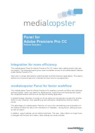 The medialoopster Panel for Adobe Premiere Pro is a fully integrated HTML5-Panel, which makes video editing simple, fast and convenient. The panel gives users immediate access to all medialoopster features inside Premiere Pro.