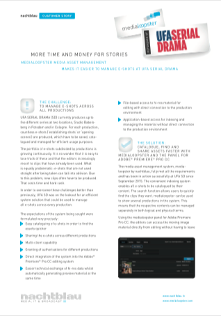The media asset management system medialoopster enables more effective management of moving images/videos in the production process. medialoopster optimises the media workflow and automates processes in the production process such as import, transcoding, file transfer and archiving. Through the use of AI technologies, medialoopster offers powerful options for automating production processes. medialoopster was developed by nachtblau and is being used successfully by well-known customers. As a full-service partner, nachtblau accompanies all work processes from planning, development and implementation to production storage, video editing and MAM systems.