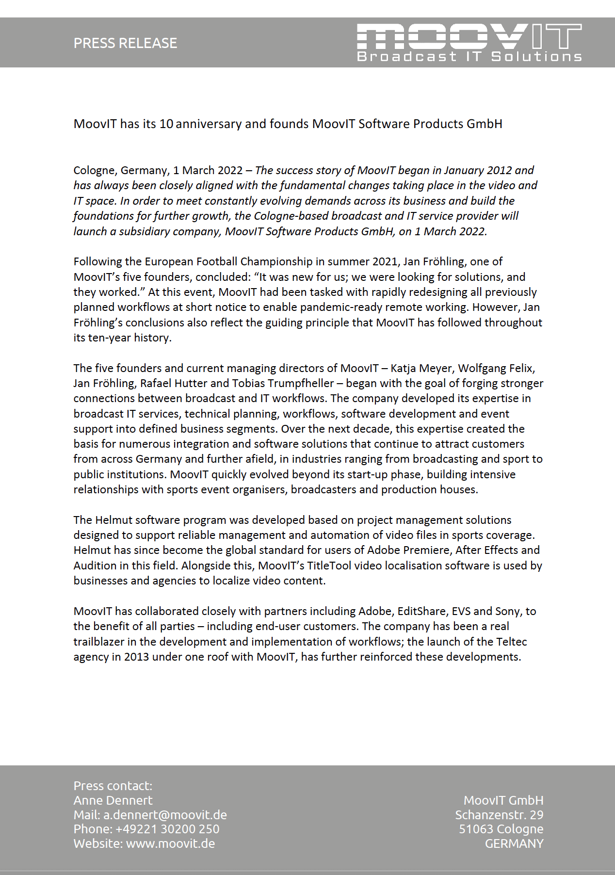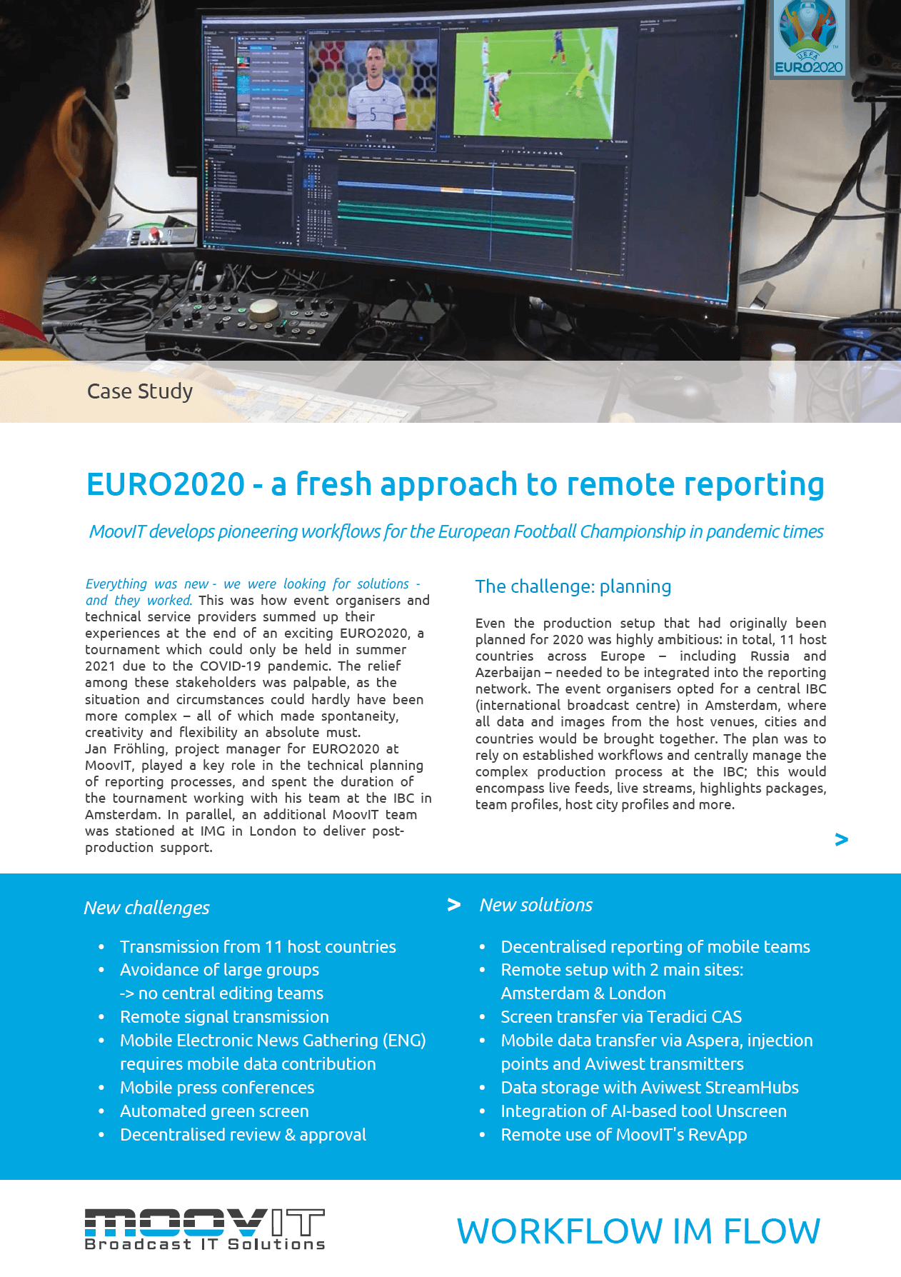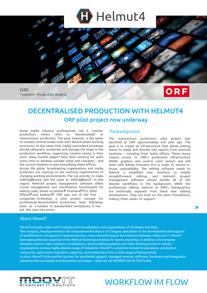 As one of Adobe’s SI partners, MoovIT specialises in the development and support of workflows for all aspects of post-production, news and archiving at the interface between video and IT. The company, headquartered in the Schanzenviertel district of Cologne, leverages particular expertise in the field of technical solutions for sports reporting. In addition, the company develops web-to-video solutions, localisations, remote editing systems and video hosting products used by organisations across a highly diverse range of industries. MoovIT’s customers include broadcasters, production companies, sport event organisers, agencies, and enterprises from a wide range of backgrounds.