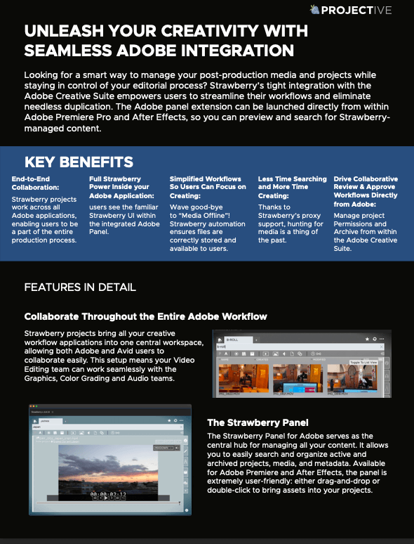 Looking to manage your post-production media and projects while staying in control of your editorial process? Strawberry’s integration with the Adobe Creative Suite streamlines your workflows and eliminates needless duplication. The Adobe panel can be launched from within Adobe Premiere Pro and After Effects, for easy search and preview.