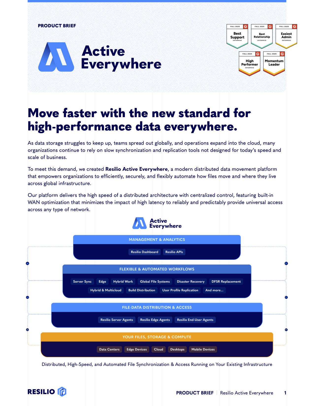 Resilio Active Everywhere connects cloud, data centers, and edge environments into a single, high-performance, active-active storage network using peer-to-peer (P2P) system design.