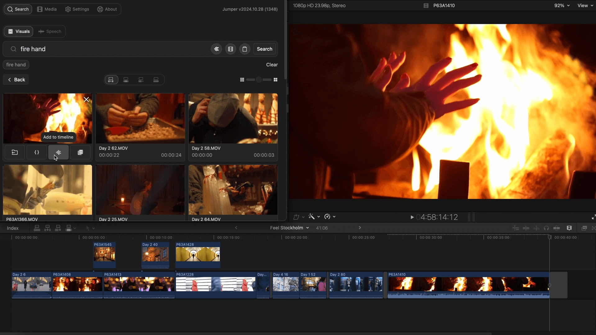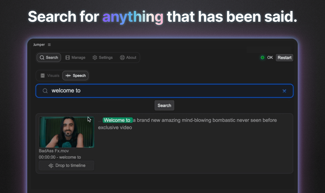 Jumper is a powerful AI search panel fully integrated into Adobe Premiere Pro. No clouds or uploads – everything happens on-device and your footage never leaves your computer. Search for any visual content or spoken words and just click it to “jump” to the matching footage in Premiere’s Source Monitor. You can also just click a button to add the matching search results to your timeline.